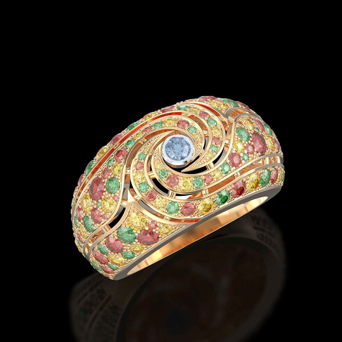 Luxury Ring with Artistic Design and Precious Gemstones – Red Gold View
