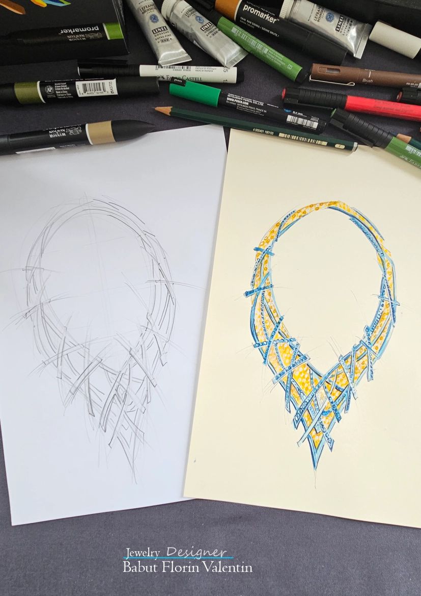 Procesul de design permite o libertate totală de expresie vizuală. Conceptul inițial poate fi realizat în creion, pentru o schiță elegantă și rafinată, în creioane colorate pentru o vizualizare cromatică detaliată, în gouache pentru un efect pictural premium sau în tehnică mixtă, atunci când se dorește o reprezentare artistică mai complexă. Pentru proiectele contemporane, schița digitală pe tabletă grafică oferă o precizie superioară și posibilitatea de a ajusta rapid proporțiile, volumele și reflexiile metalelor prețioase.