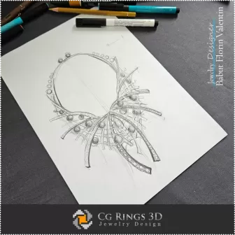 este o schiță de bijuterie de lux ce evidențiază eleganța și rafinamentul unui design exclusivist, creat de BABUT Florin Valentin, designer al companiei CGRings3D. Această reprezentare artistică în creion surprinde armonia perfectă dintre delicatețea perlelor și strălucirea diamantelor, integrate într-o compoziție simetrică și fluidă.